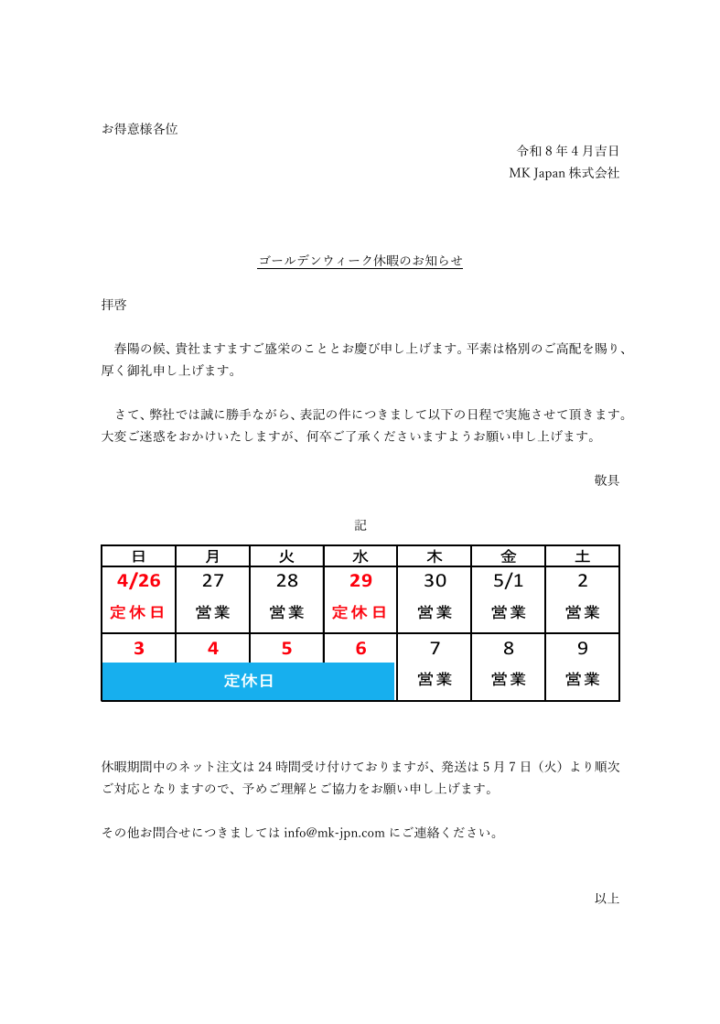 ゴールデンウィーク休暇のお知らせ